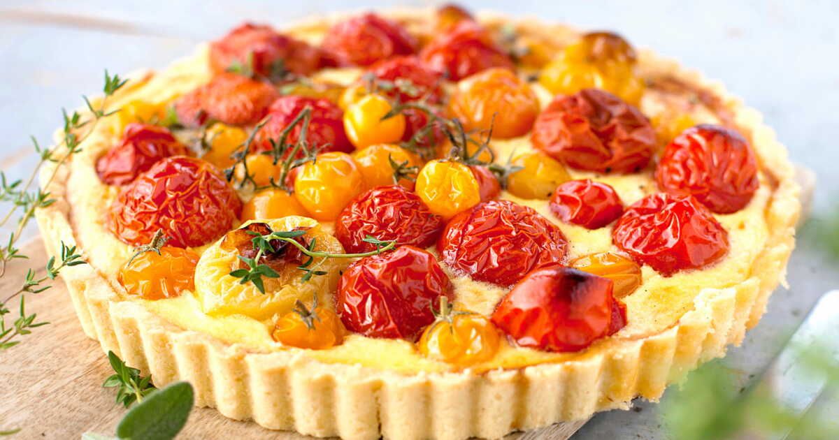 - Ajoutez les tomates cerises coupées et la grosse tomate en quartiers sur la tarte.