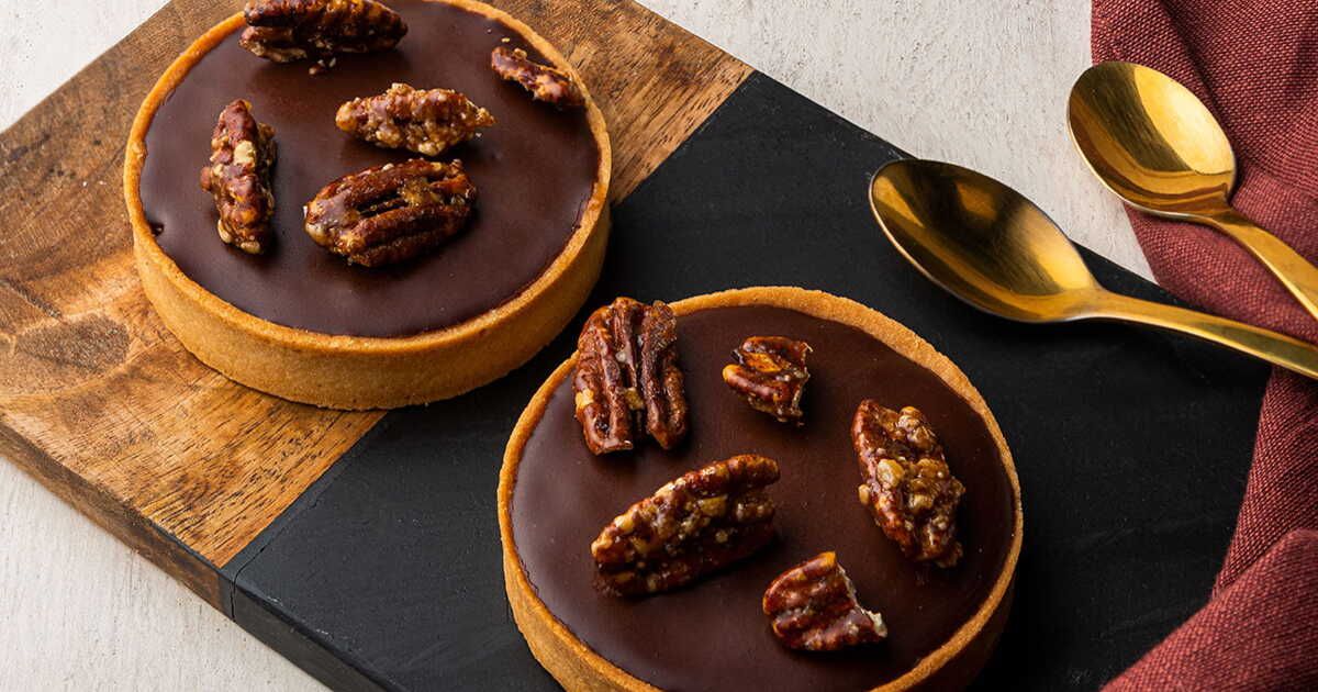 Laissez votre imagination s'envoler avec cette tarte au chocolat, un délice avéré. Garnie d'une ganache fondante, elle est agrémentée du croquant irrésistible des noix de pécan.