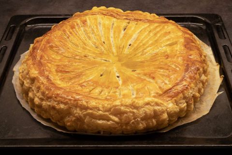 - Au four : Préchauffez le four à 150°C puis, lorsque celui-ci est éteint, placez la galette sur une plaque recouverte de papier sulfurisé. Réchauffez pendant 10 minutes.