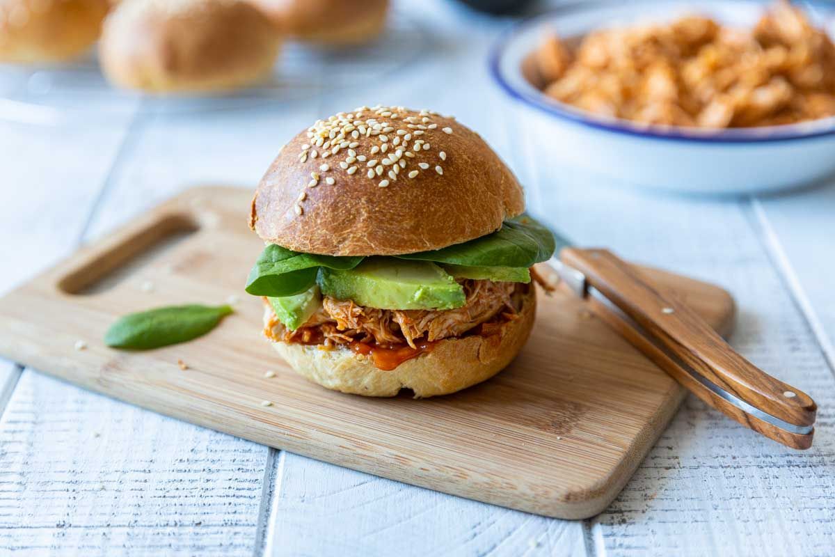 Ces burgers peuvent être accompagnés de wraps ou de tacos. Initialement, j'avais prévu des wraps, mais en raison des restrictions liées au confinement, il m’a fallu improviser avec des pains à burger faits maison. N'hésitez pas à être créatif selon vos envies culinaires ! Le pulled chicken est également délicieux servi avec une tranche de pain grillé, du fromage fondant ou en garniture de légumes frais.