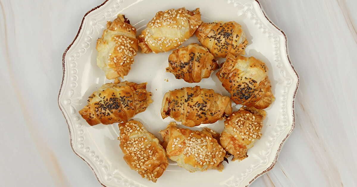 Commencez par découper des triangles dans une pâte feuilletée avec un coupe-pizza. Enroulez ensuite la pâte sur elle-même pour former des petits croissants. Appliquez-y un peu de jaune d'œuf à l'aide d'un pinceau et saupoudrez de graines de sésame. Enfournez à 190 °C pendant environ 20 minutes. Une fois refroidis, ouvrez les croissants et garnissez-les de fromage frais type St Môret, de tranches de saumon fumé, de radis finement coupés et d'une feuille de basilic. Vos invités seront conquis !