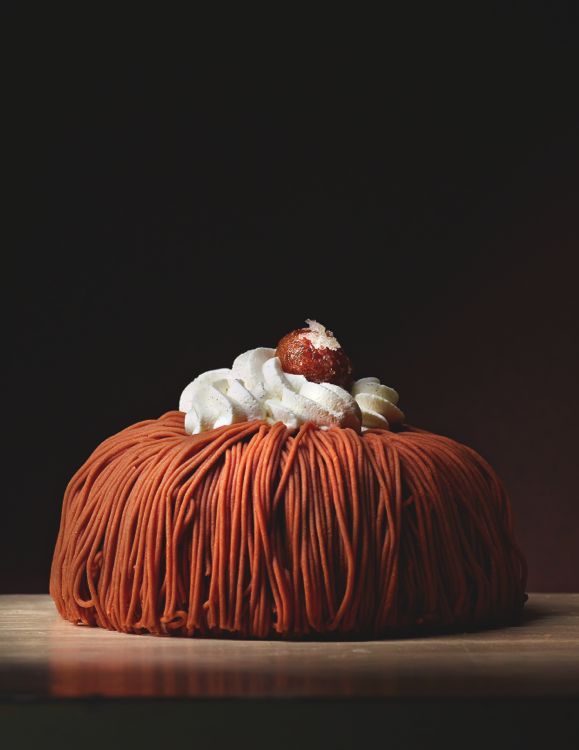 Pour assembler ce dessert, étalez et cuisez un rond de pâte sucrée de 20 cm de diamètre à 170°C pendant 15-20 minutes. Une fois refroidie, déposez une couronne de crème chantilly sur le fond de pâte, puis placez la meringue par-dessus. Recouvrez d'une couche généreuse de crème chantilly. Mettez le tout au congélateur pendant 15 minutes pour faciliter la finition. Utilisez ensuite une poche à douille remplie de crème de marron pour réaliser des filaments qui décorent la meringue. Terminez par des rosaces de chantilly et décorez avec un marron glacé pour un joli effet final.