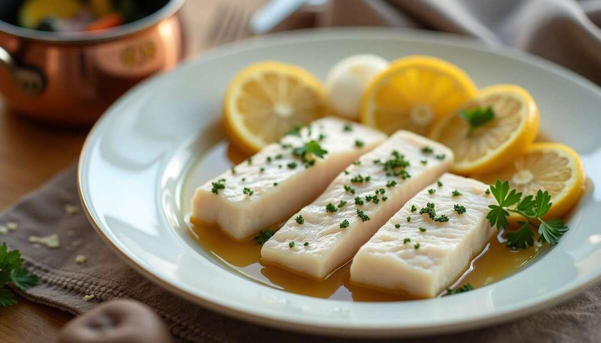 Le cabillaud est un poisson apprécié pour sa chair blanche et délicate. Ce plat s'inscrit dans la tradition culinaire française du poisson au court-bouillon, une technique qui préserve les saveurs du poisson tout en offrant une dégustation raffinée.