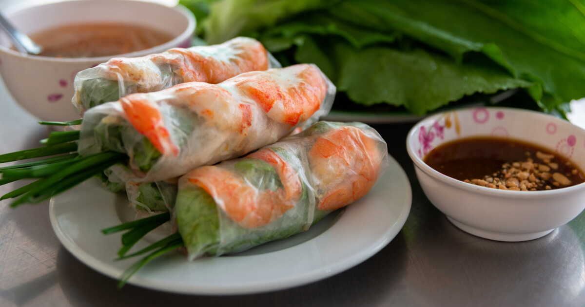 Dans un rouleau de printemps traditionnel, on trouve un mélange succulent composé de vermicelles de riz, de crevettes fraîches, de concombres coupés en julienne, de menthe, de shiso vert, de coriandre, de batavia et de radis jaune, le tout rehaussé par une sauce nuoc mam. Si le shiso fait défaut, du basilic thaï ou classique peuvent le remplacer. Pour accompagner, le chef recommande soit une sauce nuoc mam agrémentée d’herbes fraîches et de jus de yuzu, soit une sauce maison à base de carotte et de gingembre, préparée à l'aide d'une centrifugeuse.