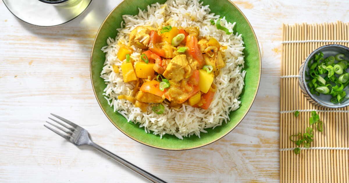 - Servez le curry avec du riz, et décorez avec des oignons nouveaux.