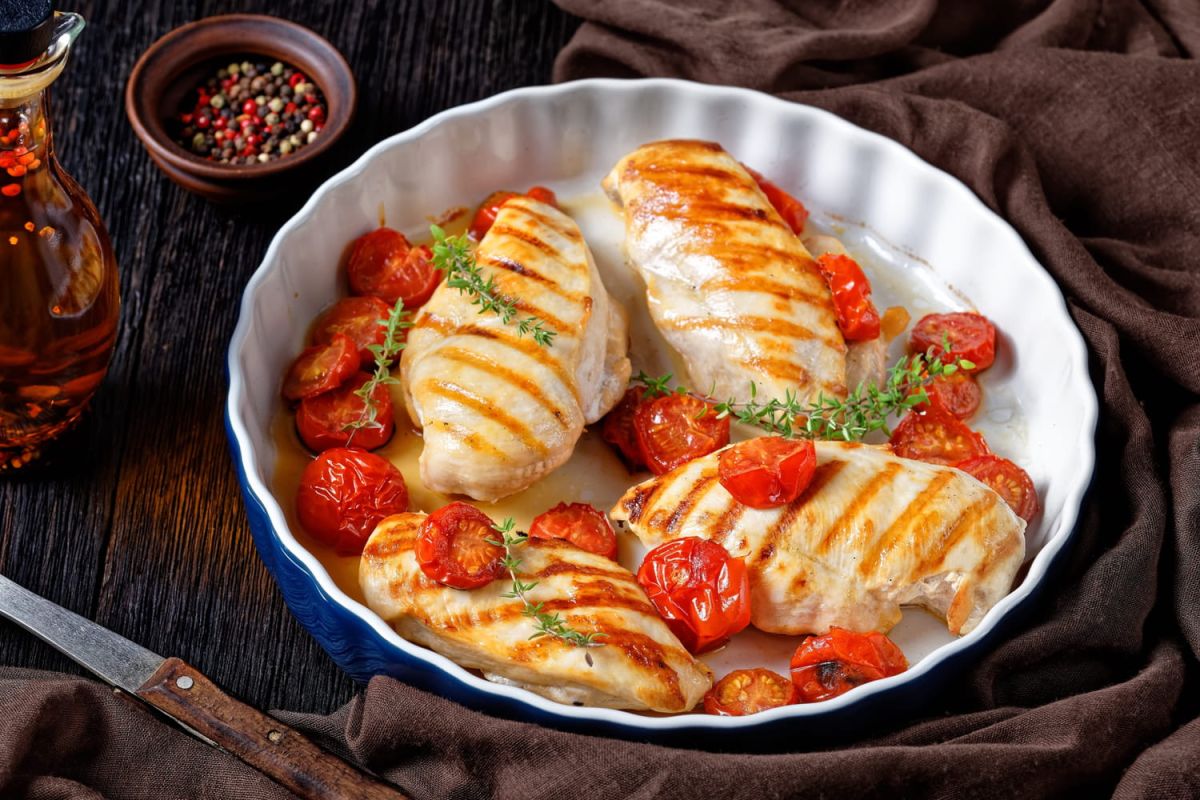 - Préparez le poulet en y plaçant quelques gousses d'ail et des tomates cerises, accompagnées d'oignons rouges.