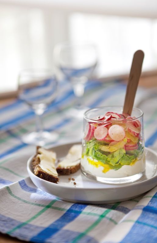 Commencez par couper les fanes de radis, puis hachez-en une partie. Lavez et séchez les radis avant de les couper en rondelles. Dans un saladier, mélangez le vinaigre, l’huile et le sel, ajoutez les radis et l’oignon ciselé. Pour la ricotta, associez-la au wasabi en mélangeant bien. Montez vos verrines avec une couche de ricotta, suivie des fanes, puis de la salade de radis. Accompagnez de pain noir beurré ou de gressins au sésame.