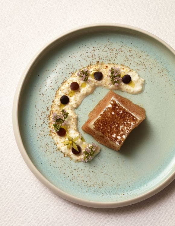 Assemblage : Mixez la burrata. Façonnez des cercles d'olive. Sur chaque assiette, disposez un trait de burrata, les ronds d'olive et les feuilles d'origan. Ajoutez la poudre de tomate, puis placez le carré de focaccia au centre, avec un peu d’anchoïade râpée.